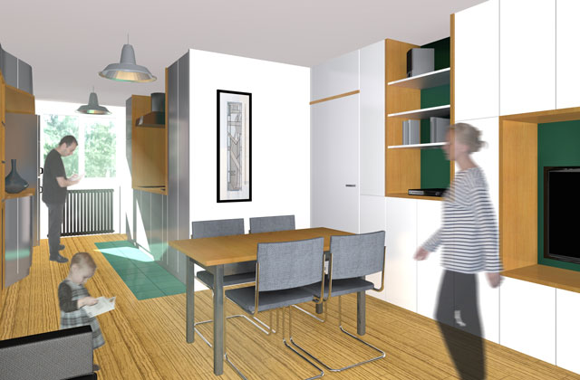 À l’origine, la cuisine est séparée du séjour par un hall d’entrée. Les surfaces de ces pièces ne correspondant plus aux besoins actuels, le projet prévoit d’abattre les deux cloisons formant le hall pour créer une pièce unique traversante. L’appartement souffrant d’un manque de rangements, le projet s’appuie sur la création d’un ensemble de mobilier – placards, niches, étagères, penderie, etc. – permettant d’homogénéiser la perception de la nouvelle pièce qui englobe séjour et cuisine, tout en dissimulant la porte d'entrée.