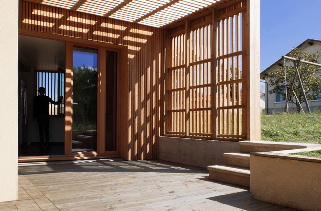 Cette extension offre un espace convivial de repas à cette famille de cinq personnes. Le projet se présente comme un paravent de bois (tasseaux à claire-voie) dissimulant ouvertures et terrasse ombragée.